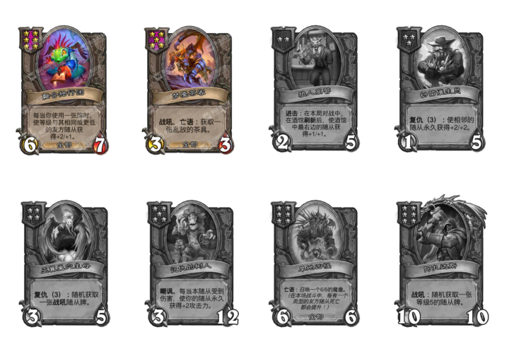 中立随从里只回归了融合独行团,同时把buff效果从+1/+1上调到了+2/+1,而老随从里则是把梦魇茶客从6星6/6降级到了5星3/3,退环境的中立随从有狼人高管幼苗催生员,巫翼巢穴主母,记仇的树人,旱地凶怪和阿扎达斯,还好,六本龙不至于有那么多融合怪污染末世龙蛋的池子。
