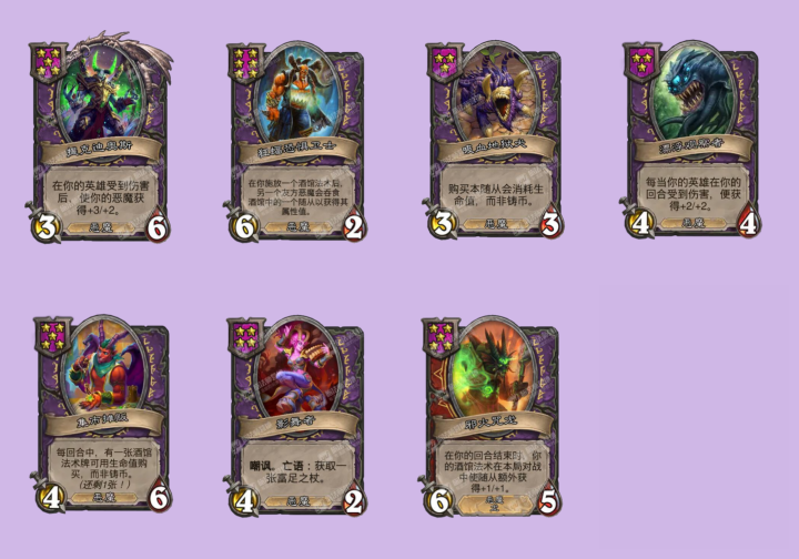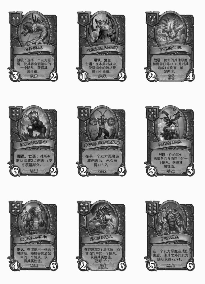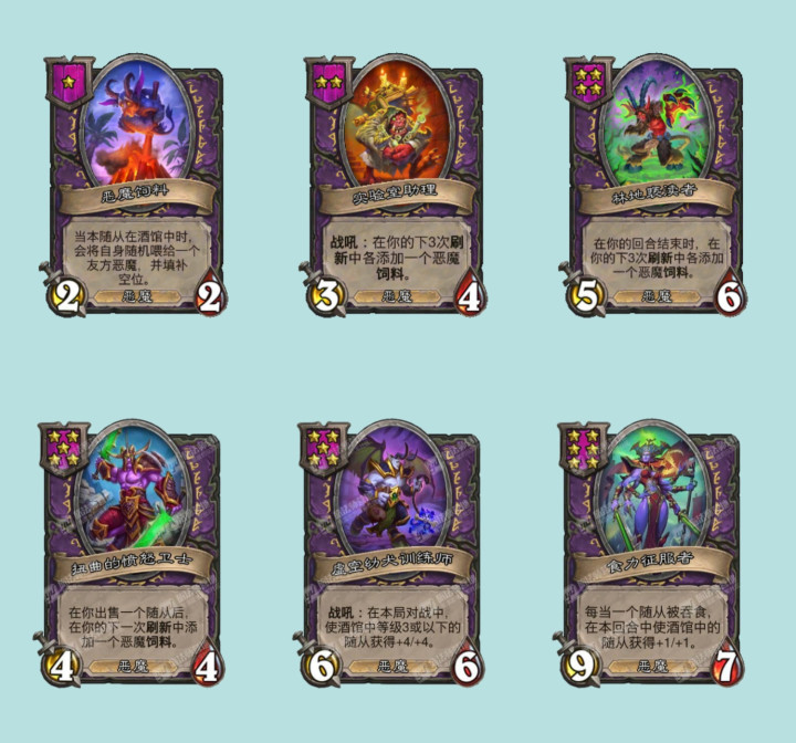 这次恶魔种族主要的新卡都是围绕“恶魔饲料”这个新棋子展开的,首先这个恶魔饲料好像只是衍生物,不是酒馆里独立的棋子,所以不可能有鲍勃一回合给你刷仨恶魔饲料全吃了的情况,除了之前在补丁公告里已经预告过的实验室助理和林地亵渎者,还有5星4/4扭曲的愤怒卫士也可以往牌库里塞恶魔饲料,出售一个随从就能在下一次刷新里塞一个,不过不知道一次性出售多个随从是怎么结算的。同时新棋子里必不可少的是给酒馆里恶魔buff的手段,比如5星6/6的虚空幼犬训练师,战吼使本局酒馆中三星以下的随从获得+4/+4,最主要是buff恶魔饲料的,而新的六本核心食力征服者则是每当一个随从被吞食,都会在本回合中使酒馆中的随从获得+1/+1。