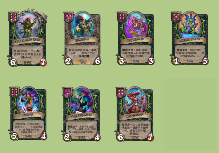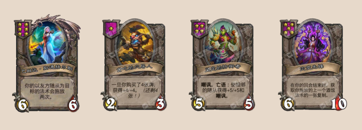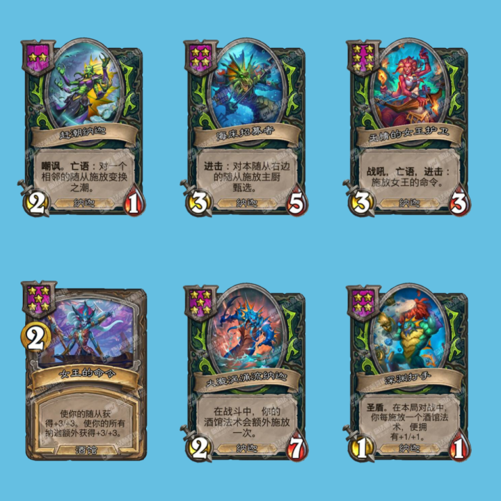 接下来是纳迦种族,新赛季的纳迦和酒馆法术更加绑定了,并且多了很多战斗中释放酒馆法术的随从,比如2星2/1的赶潮纳迦,嘲讽。亡语:对一个相邻的随从施放变换之潮,4星3/5的海床招募者,进击:对本随从右边的随从施放主厨甄选,6星3/3,无情的女王护卫,战吼,亡语,进击:施放女王的命令,这个女王的命令和艾泽里特强化很像,只不过只有纳迦可以享受到两次buff。当然也有和释放酒馆法术有联动的新随从,5星2/7的大漩涡涌流纳迦,在战斗中,你的酒馆法术会额外施放一次,而4星1/1的深渊打手具有圣盾属性,并且本局对战中你每释放过一个酒馆法术,便拥有+1/+1。