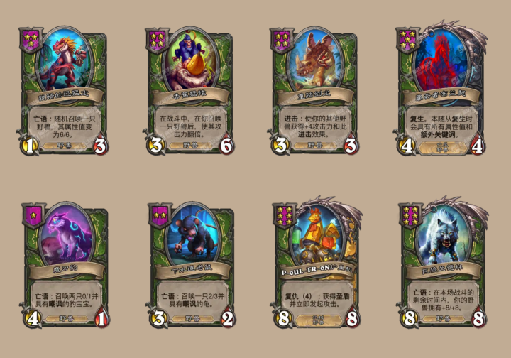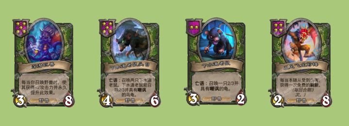 野兽种族没有新的玩法,只是把以前的召唤流野兽回归了,新随从5星3/8的深潜巨兽,每当你召唤野兽时,使其获得+2攻击力并永久提升此效果,战斗中召唤也是可以提升这个效果的,5星4/6的下水道老鼠头目,亡语可以召唤两只下水道老鼠,而下水道老鼠就是亡语招2/3龟龟的老棋子,变种机械小马属于是。另外还有一个新随从双足飞龙前锋,4星2/8,每当本随从受到伤害,获得一次免费的刷新,算是给受伤流野兽的补强。