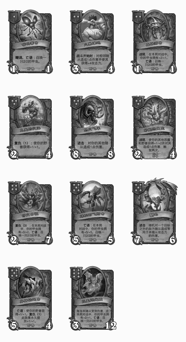 野兽种族回归的棋子是狡猾的迅猛龙,香蕉猛猿,重踏剑龙,罪奔者布兰契,魔刃豹,下水道老鼠,P-0UL-TR-0N护巢机和巨狼戈德林,没错,猿神,亡灵马和护巢鸡哥都回归了,不过狡猾的迅猛龙从4星1/4下调到3星1/3了,亡语招的野兽身材也从8/8下调为6/6,香蕉猛猿从5星下调为4星,同时他也只翻倍召唤野兽的攻击力了,重踏剑龙则是将加攻效果从3点上调为4点,罪奔者布兰契从4星上调到了5星,同时现在复生时会具有所有属性值和额外关键词,希望这次别出无限复生的bug了。