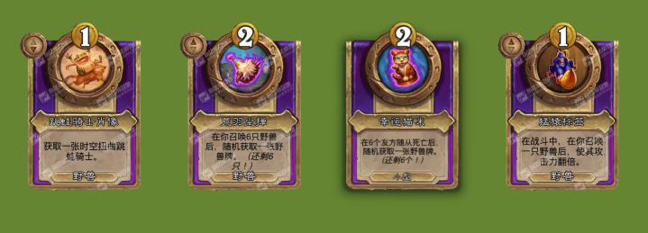 野兽饰品里,时空扭曲跳蛙骑士也被做成了小型饰品跳蛙骑士肖像,又能继续在酒馆里玩跳蛙了,大型饰品里,荒羽尘掸是在你召唤6只野兽后,随机获取一张野兽牌,小型饰品里回归的幸运猫咪是死亡6个友方随从后随机获取一张野兽牌,如果两个饰品都拿到了还能配合,这么一看荒羽尘掸其实是逗猫棒?另外猛猿标签回归后,效果也变成只翻倍攻击力了。