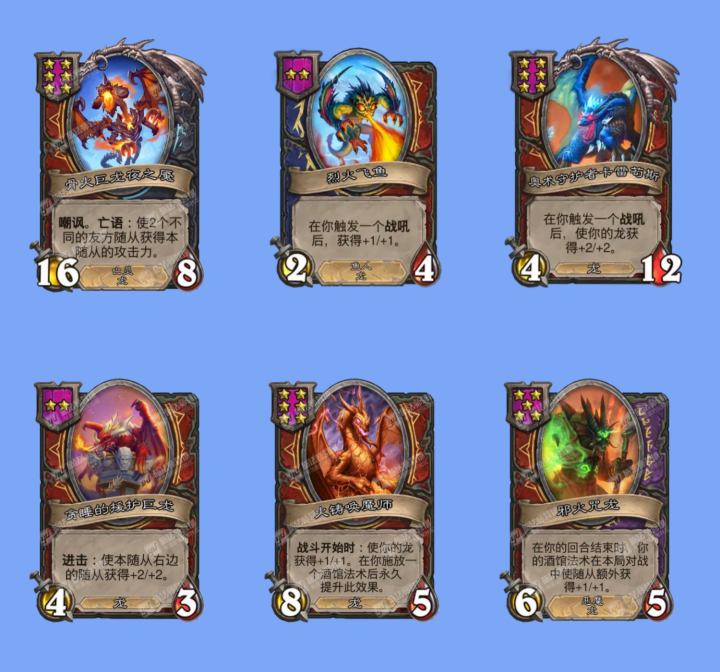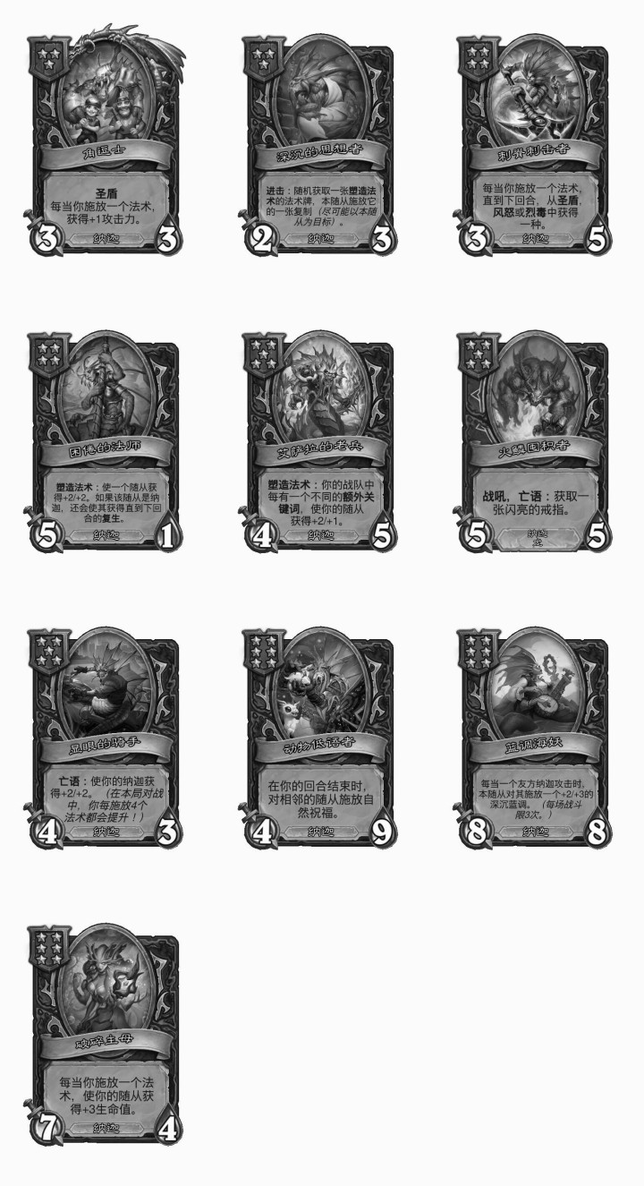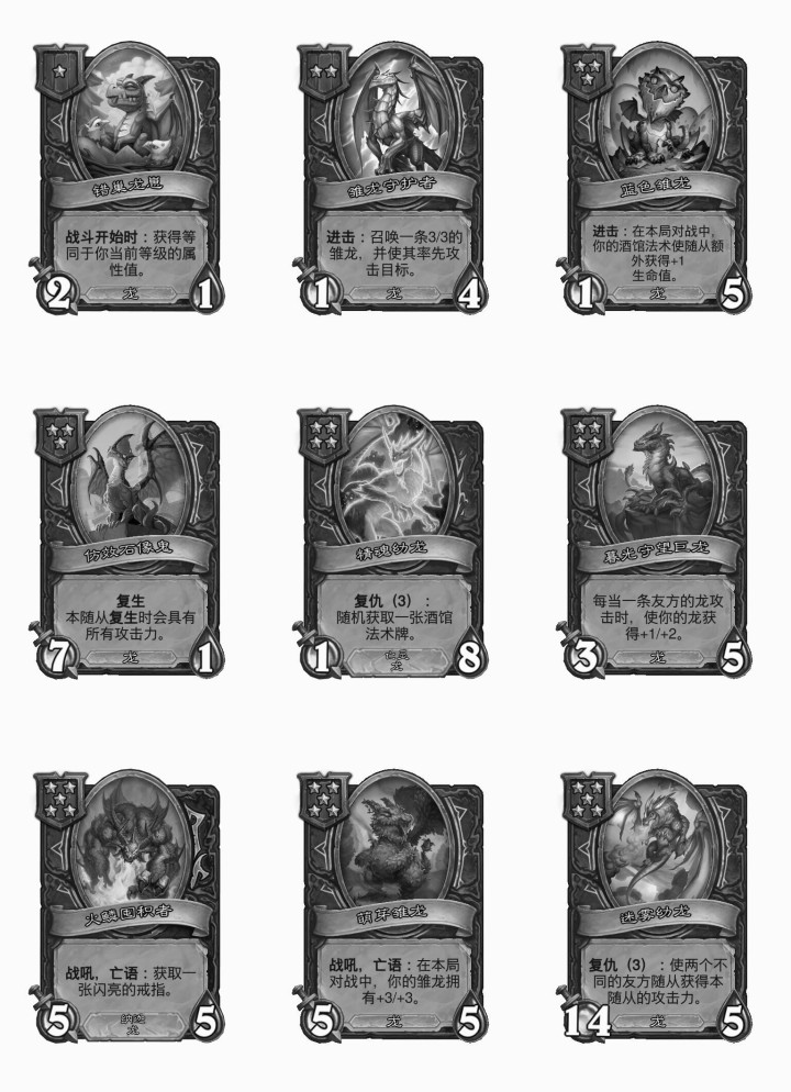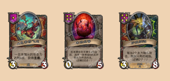 其他新随从里,血色幸存飞龙,1星3/3的龙,一旦他达到6攻的时候就会获得圣盾,前中期还是有点强度的,末世龙蛋,4星0/5,本牌在你手牌中2回合后,选择一条等级6的龙并孵化为所选的龙,憋在手里俩回合就会变成核心,中后期场面上格子填满的时候拿到还可以,三碰四碰出来也能迅速拿到核心,缺点就是可能当回合要掉大血。护戒纳迦,5星3/8,纳迦+龙双种族随从,每当2个友方随从攻击,施放闪亮的戒指,感觉也是和龙的频率体系搭配的。