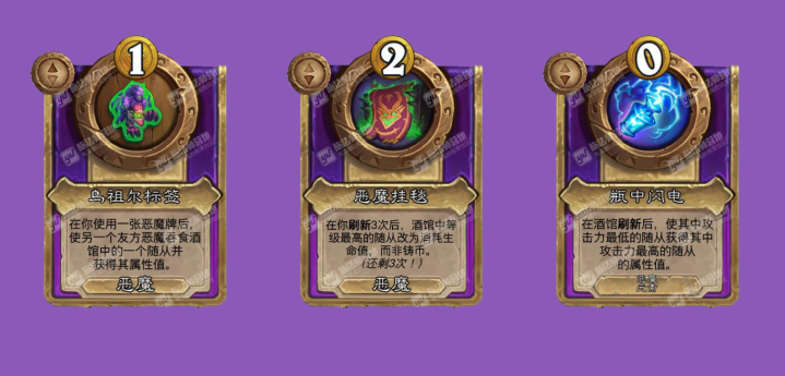 不过乌祖尔虽然退环境了,但是恶魔的大型饰品里倒是有乌祖尔标签,可以继承乌祖尔的遗志,另外还有一张小型饰品恶魔挂毯,每刷新三次,酒馆里的最高等级的随从就会变成消耗生命值购买,其实对于恶魔流而言相当于把买怪的费用分摊到刷新上了,耗血还能配合恶魔自己的玩法,而且定向变最高等级的随从,感觉还是挺不错的,瓶中闪电则是让商店刷新后,其中攻击力最低的随从获得攻击力最高的随从的属性值,值得一提的是,这个饰品是元素+恶魔双种族饰品,所以元素的buff酒馆玩法还在,酸雨应该也没退,另外这个饰品用来给酒馆里的瑞文buff身材倒也挺不错的。