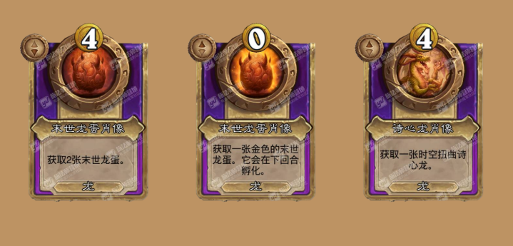 龙种族的饰品里感觉有意思的都是和龙蛋相关的,小型饰品末世龙蛋肖像,可以直接获得两张末世龙蛋,两回合后出俩火铸唤魔师还是挺强的,也难怪火铸唤魔师被削了,其实出俩卡雷在多彩幼龙版本也还不错,最怕的就是六本还有一些融合怪,导致你红皮蜥蜴和蓝皮蜥蜴一条拿一张……而末世龙蛋肖像的大型版本则是直接0费获得一张金色的末世龙蛋,并且它会在下回合孵化,感觉要比小型饰品好用。另外回归的旧饰品里,诗心龙肖像现在改成了可以全场保留身材的时空扭曲诗心龙了,这个感觉很不错。