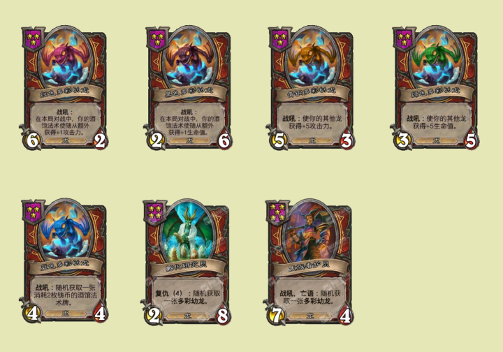 巨龙种族的新玩法是多彩幼龙,五色多彩幼龙本身就是酒馆里独立的随从,也可以通过饰品以及随从衍生出来,比如新随从4星2/8孵化研究员的复仇效果,新赛季龙的跳操体系没有完全退干净,所以还是有一点频率的,还有一张5星7/4的龙族看护员,战吼和亡语都能获得一条多彩幼龙,出了这么多战吼龙,大家应该能猜到了,没错,蓝皮蜥蜴又回来了。