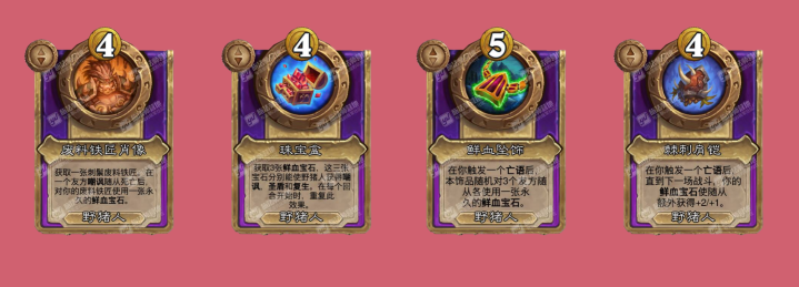 新赛季野猪人的新饰品里,废料铁匠肖像获得的刺鬃废料铁匠在嘲讽随从死亡后不仅能给手牌里塞鲜血宝石,还会给自己贴永久的鲜血宝石,珠宝盒则是每回合给三张分别带有嘲讽,圣盾,复生特殊效果的鲜血宝石,其实很快场上就遍地嘲讽圣盾复生野猪人了。另外新赛季亡语随从对野猪人也很关键,因此棘刺肩铠和鲜血坠饰都是和触发亡语相关的,不过这俩都是“触发一个亡语”,不知道和“触发一次亡语”是不是一样的,配合金瑞文和金鹦鹉不知道能不能疯狂触发效果。