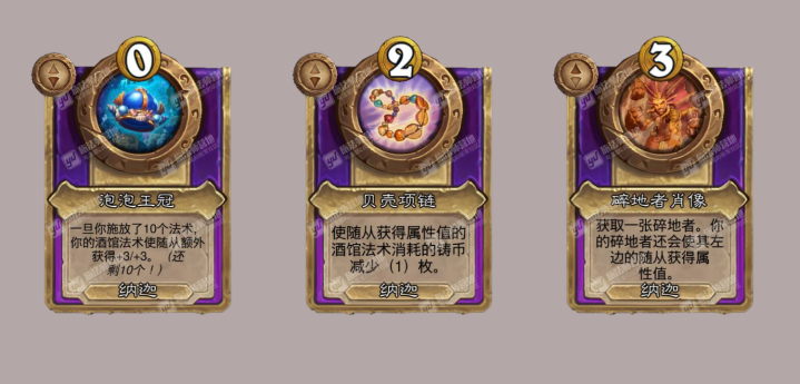 纳迦的新饰品基本都是和法术有关的,新的小型饰品泡泡王冠,这个能使效果应该是只能触发一次,最多只能+3/+3,毕竟是小型法术,也不能要求太多,贝壳项链则是可以给能使随从获得属性值的酒馆法术减少1费,不过问题是新赛季纳迦玩的是战斗中释放酒馆法术,这个效果好像和纳迦也不是特别搭。大型饰品里新增了碎地者肖像,可以使你的碎地者还会使其左边的随从获得属性值,碎地者的缺点就是养完后场上只有一个特别大的大哥,这个饰品相对能缓解这张情况。