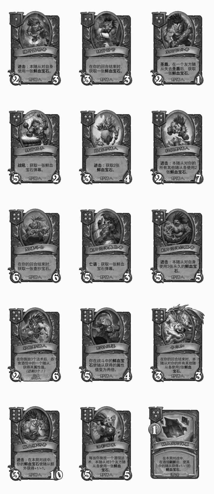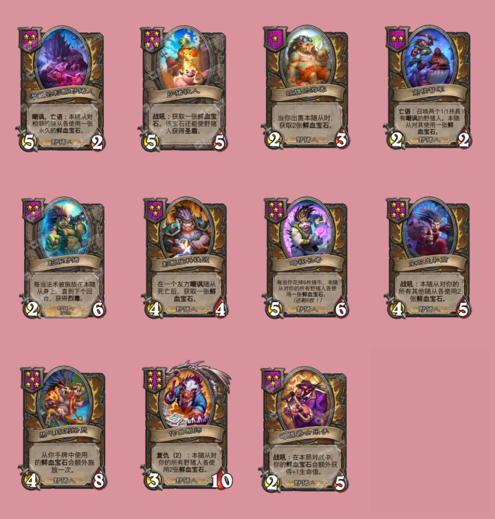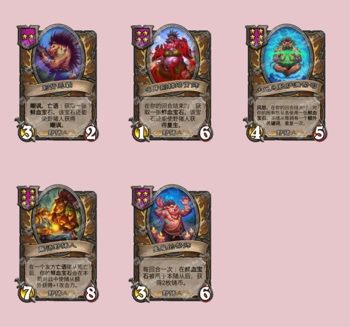 新赛季的野猪人玩法稍微有些不同,因为野猪人开始学鱼人玩起关键词了,新随从刺背恶霸,2星3/2,嘲讽。亡语:获得一张鲜血宝石,这颗宝石还能使野猪人获得嘲讽,新随从赤牙荆棘培育师,4星1/6,回合结束时获得一张鲜血宝石,这颗宝石还能使野猪人获得复生,而这个流派的核心是6星4/5的大地之歌萨满祭司,随从本身有风怒关键词,回合结束时,对你的所有随从各使用一张鲜血宝石,本随从每拥有一个额外关键词重复一次,嘲讽风怒圣盾复生,所以每回合应该最多可以使用五次。而养鲜血宝石的玩法也没有丢,另一张6星星随从藤语野猪人,在一个友方亡语随从死亡后,本局鲜血宝石额外+1攻,另外鲜血宝石作用于4星3/6的新随从受雇的祭师身上后,还可以获得2枚铸币,每回合限一次。