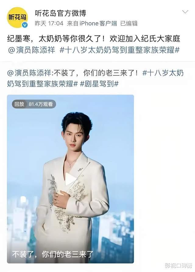 由流量女演员李柯以饰演大女主容遇的爆款短剧《18岁太奶奶驾到,重整家族荣耀3》已于9月28日低调开机。之所以会确定这个时间点,是因为男演员陈添祥在9月27日的直播间透露将于明日进组《18岁太奶奶驾到,重整家族荣耀3》,饰演女主的第三个重孙子。期待已久的老三终于摘下神秘面纱,实时追剧的观众们还是很激动的。尤其是老三的职业还不一般,剧情相较于以往肯定更精彩。