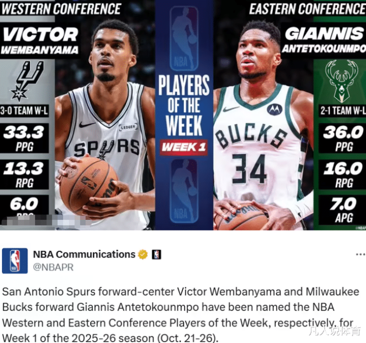 北京时间 10 月 28 日,NBA 官方正式公布了 2025-26 赛季首周的周最佳球员名单。圣安东尼奥马刺队的超级新星维克多 - 文班亚马凭借惊艳表现当选西部周最佳球员,密尔沃基雄鹿队的扬尼斯 - 阿德托昆博则斩获东部周最佳球员荣誉。这是文班亚马职业生涯第二次当选周最佳球员,而对于字母哥而言,这已经是他生涯第 28 次获此殊荣,距离追平联盟传奇巨星勒布朗 - 詹姆斯的纪录仅一步之遥。