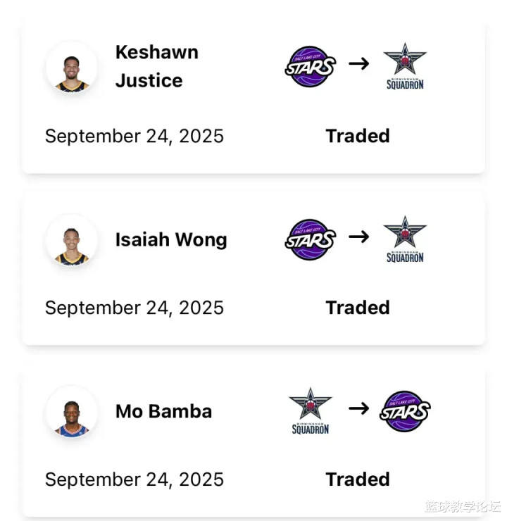 北京时间9月27日,据爵士记者Ben Anderson报道,爵士附属球队盐湖城星光队,将以赛亚-王和基肖恩-贾斯蒂斯送至鹈鹕附属的伯明翰中队,2换1交易得到班巴。新赛季班巴将代表盐湖城星光队出战发展联盟比赛,正式告别NBA。