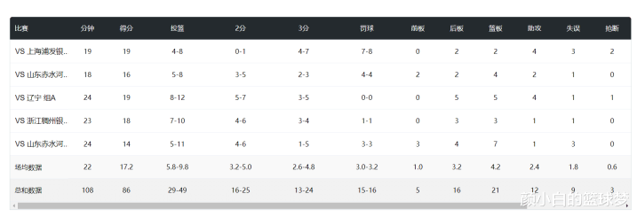 为什么说罗欣棫是绝对的核心呢?江苏女篮这5场比赛只有罗欣棫一人做到每一场比赛都得分上双,场均22分钟,拿到17.2分4.2篮板2.4助攻0.6抢断0.2盖帽,命中率59.1%,三分命中率54.1%,就算对阵山东女篮这场三分球5中1,罗欣棫的三分命中率还在五成以上!
