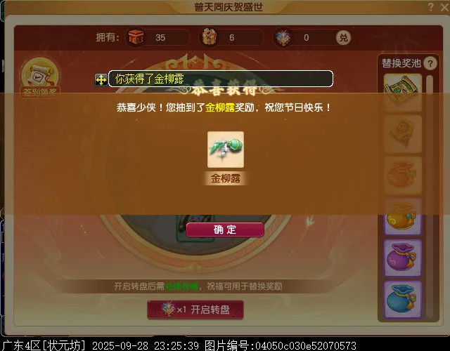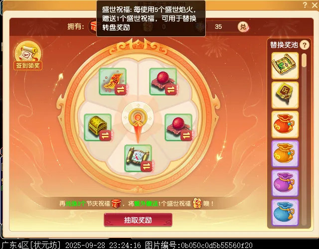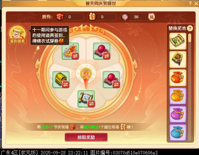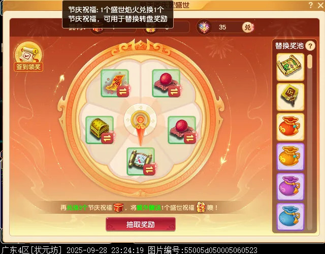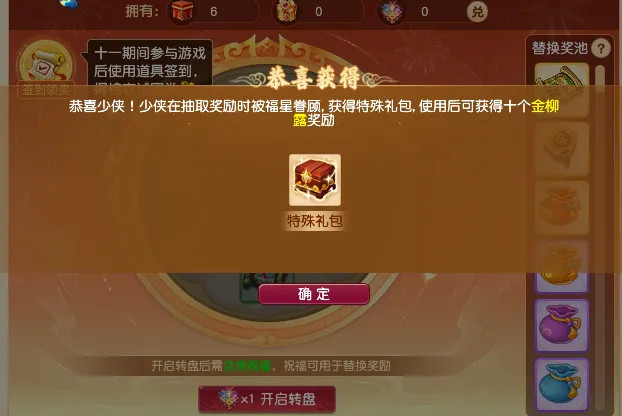 十一中秋双节活动期间,玩家参与环式、小副本、挑战、单人玩法时,有机会获得抽奖烟花,右键使用可以解锁转盘,初始有两个变异修炼果,玩家可消耗烟花进行替换。