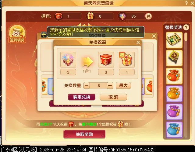 官网的替换规则有点把人绕晕的感觉,不用去理解,实际你只要看上面的烟花数目,然后替换时循规蹈矩地消耗/合成即可。其中,替换物品是需要看动画的,抽奖时也要看动画,且无法跳过,并且抽之前还有个弹窗提醒,这里面就有隐藏的时间成本,散人会觉得很烦,多开建议在系统跑动画时操作其他号,可提升抽奖体验。